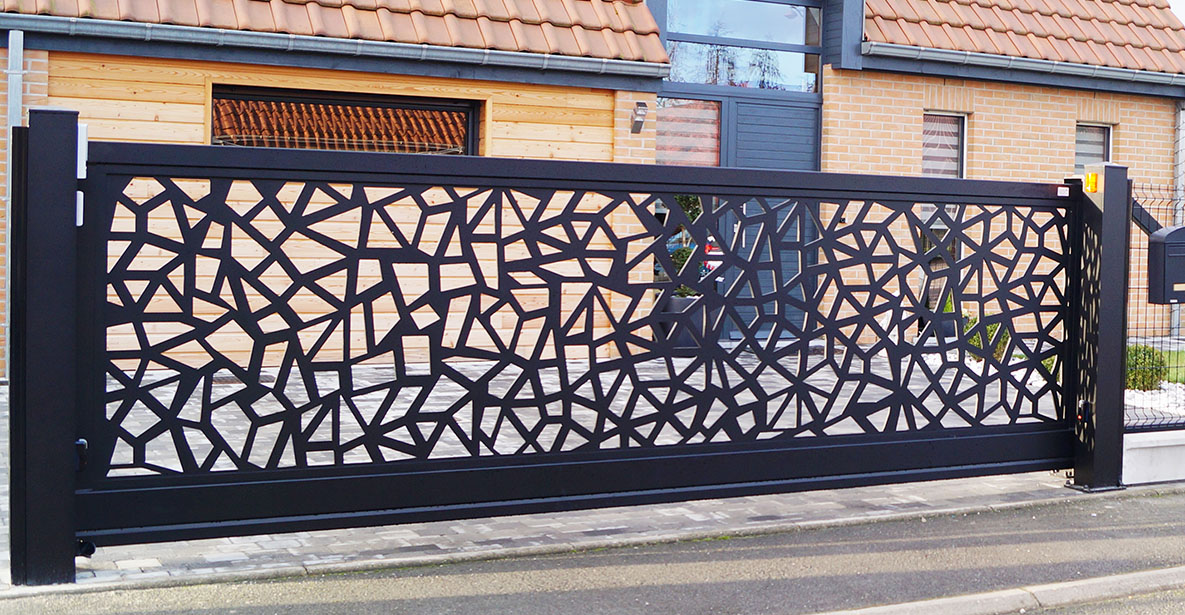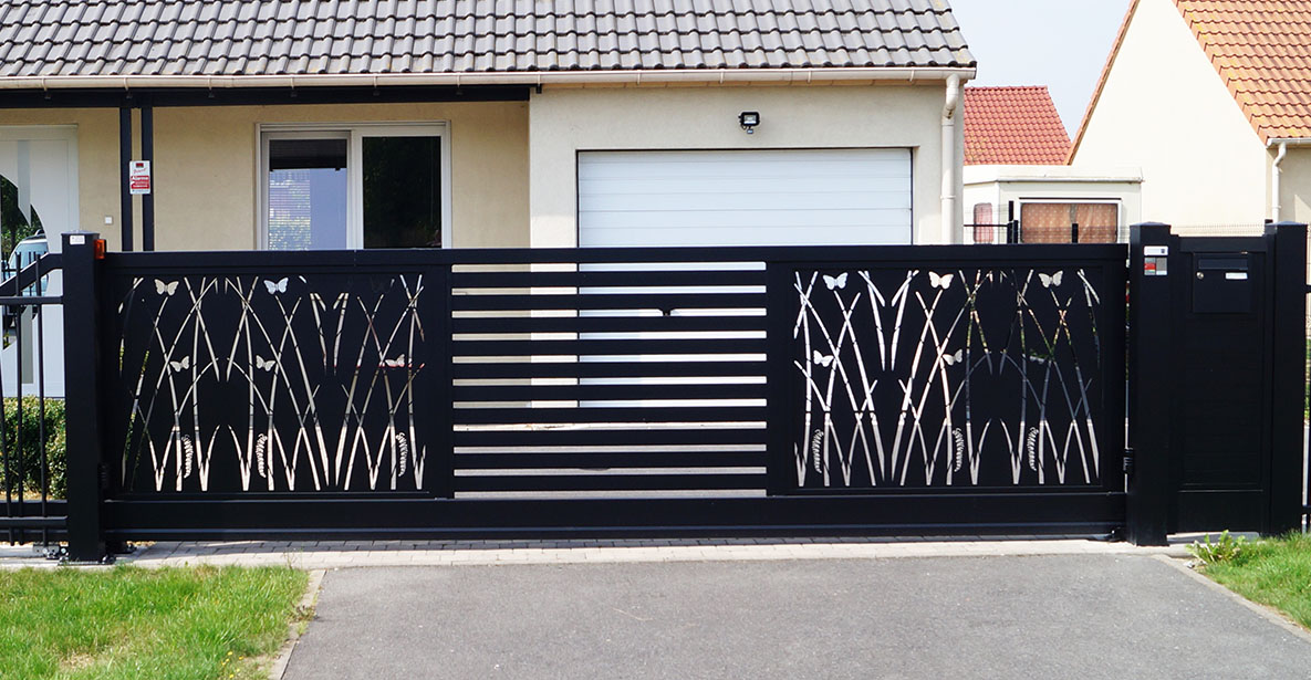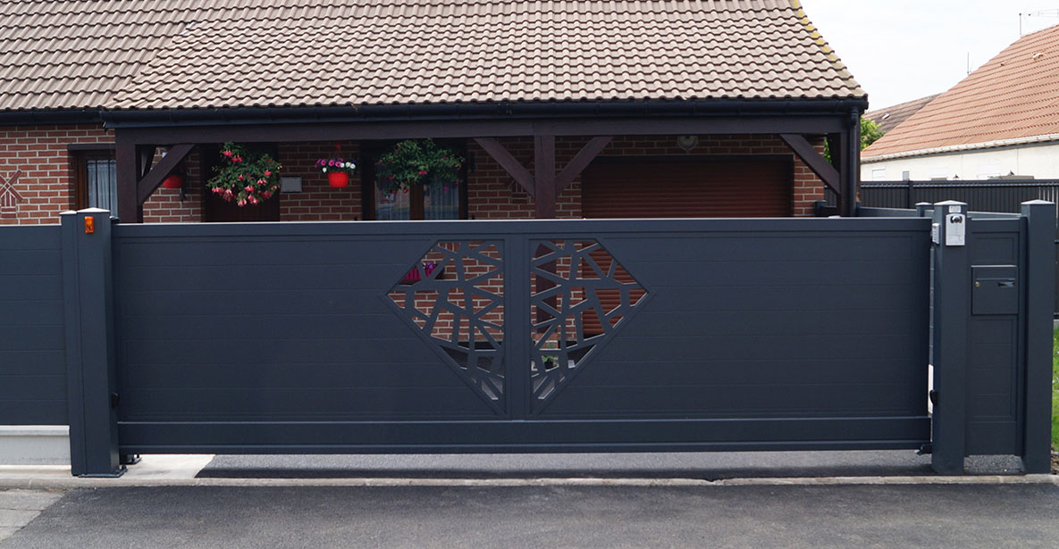 - Portail autoportant (en porte à faux) : le portail ne comporte aucun rail au sol et pas besoin de longrine en béton pour sceller ou supporter le rail.