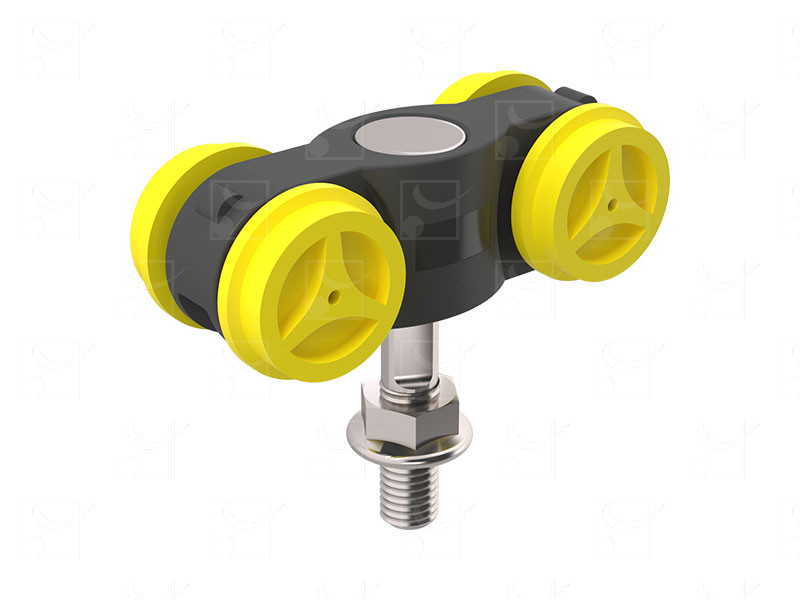 Monture équipée de 4 galets, axes montés sur roulements à billes, vis M8 en INOX A4 (59 mm). Pour panneaux à déplacement manuel sans synchronisation – 80 kg max. / panneau.