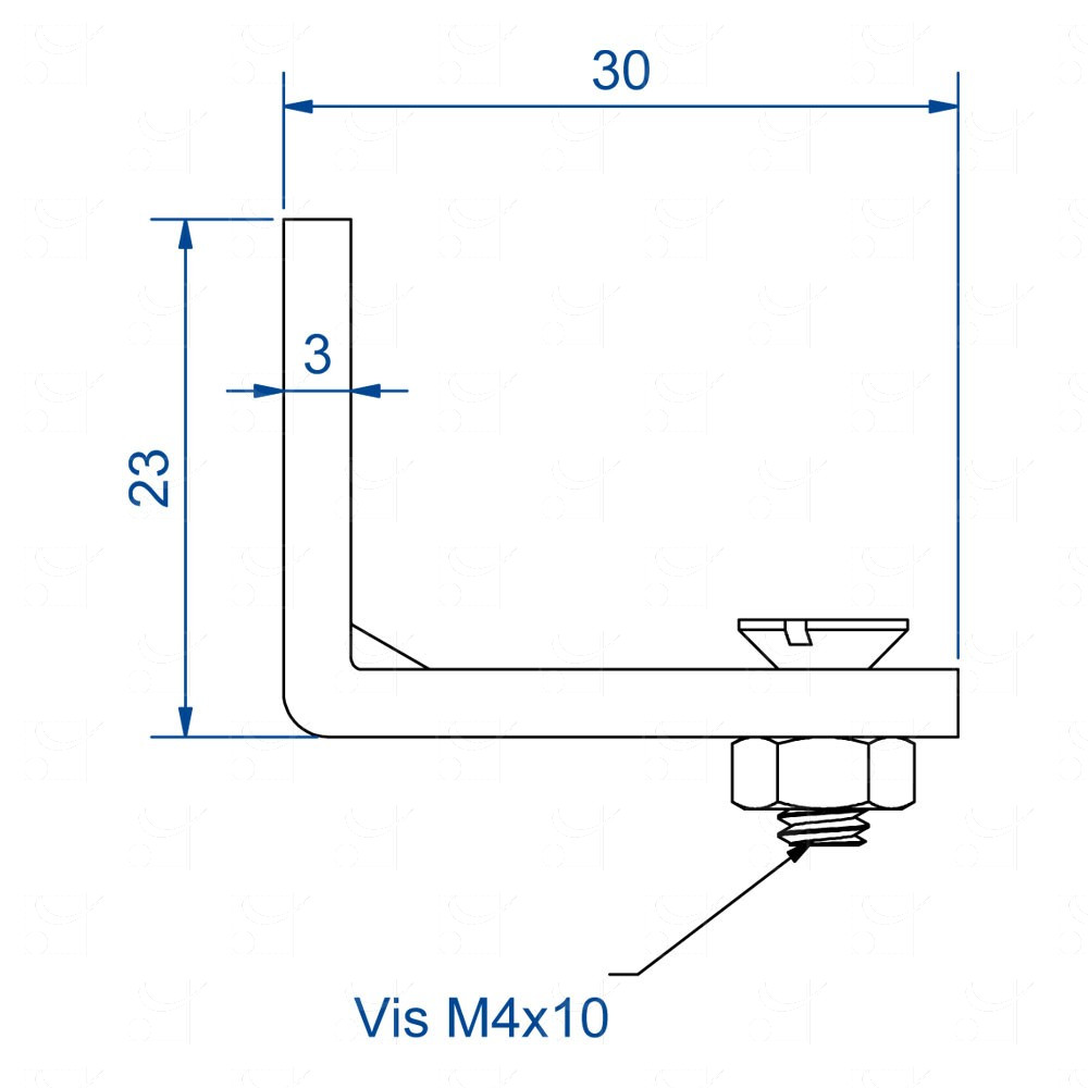 Hoogte = 23 mm – Lengte = 30 mm – dikte 30/10e. Te bevestigen om de 0,44 m.